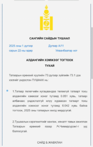 2025 онд Татварын Алдангийн хувь хэмжээ хоног тутамд: – Татвар төлөгч татвараа хугацаандаа төлөөгүй бол 0.051%– Татварын албанаас үндэслэлгүй илүү хураасан бол 0.042%
